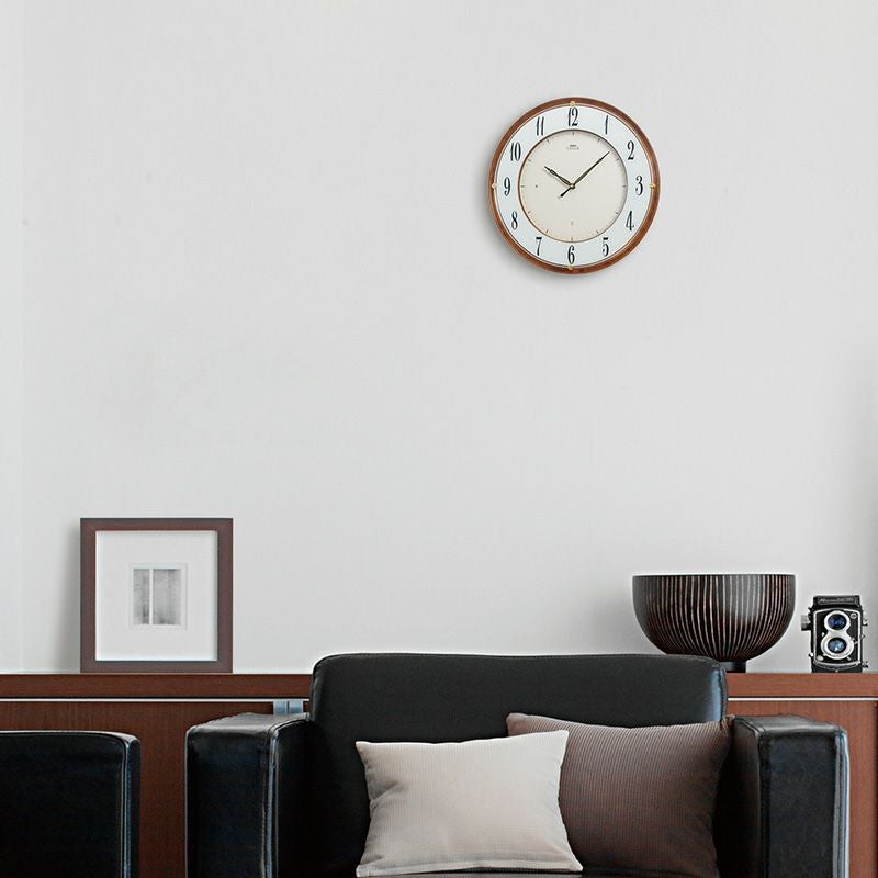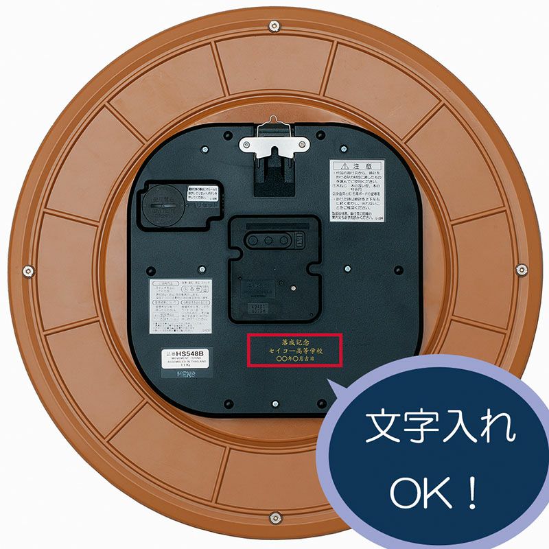 カテゴリトップに戻る サイズ 直径351×30(mm) 重量 1.1kg 電池 リチウムボタン電池CR2450×1(電池寿命約5年) 主な素材 プラスチック枠 (茶マーブル模様塗装 光沢仕上げ)
