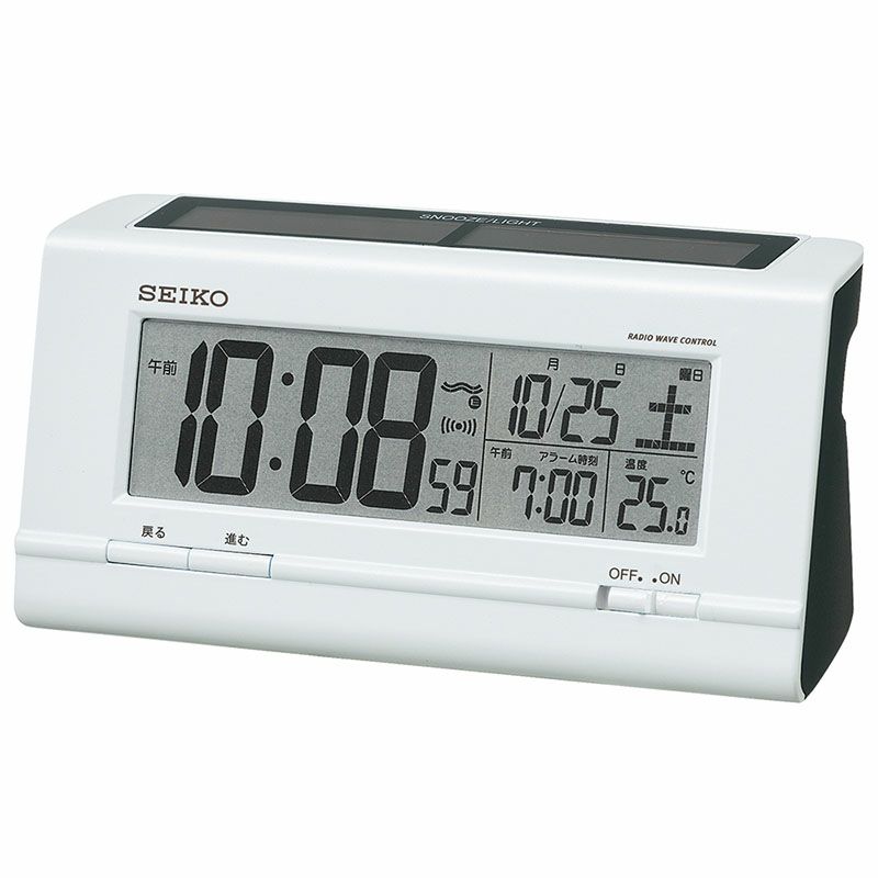 明るい場所ではソーラーで、暗い場所では電池で動く、2つの電源で電池が長持ちするハイブリッドソーラーを搭載した電波目ざまし時計。