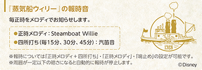 毎正時には「Steamboat Willie」のメロディ、また、15分ごとに汽笛の音で時の訪れをお知らせします。