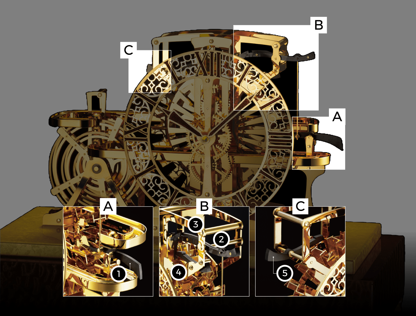 - 3. 回転機構のパケットは一つ分回転し、再びストッパーの「レバー④」が働き、「レバー⑤」は逆回転を防ぐストッパーとして作動します。(画像B、C)結果、時計は37.5秒の時を刻み、1日2,304回この動作を繰り返します。