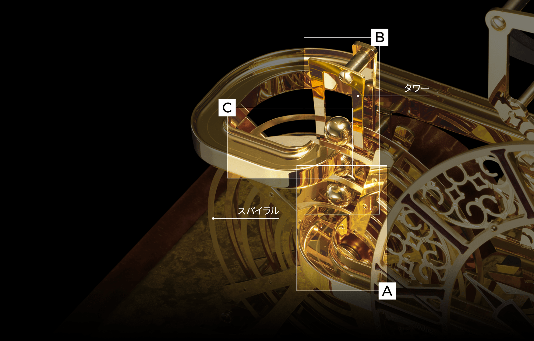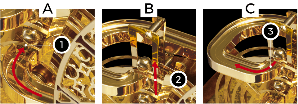 - 3. スパイラルの出口から鋼球が飛び出します。(画像C-③)スパイラルの入口に鋼球が飛び込む絶妙なタイミングは、レールの距離と斜度・摩擦などの綿密な計算により成り立っています。また、スパイラルの回転する力を鋼球がタワーに上っていく力に変換することで、極限の省力化に成功しています。