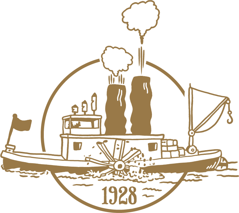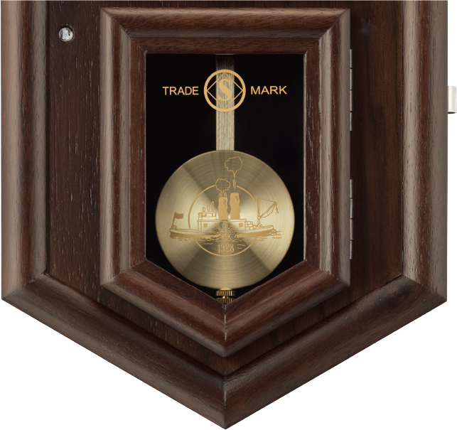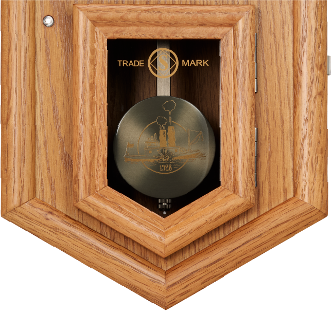 開閉可能な扉のガラスには創業時の丸角Sマーク、振り子には蒸気船のアートを使用。